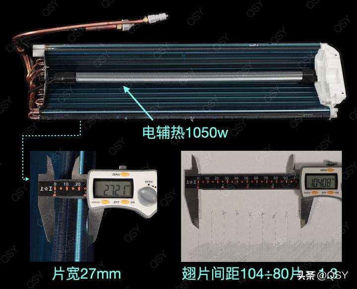 ▲巨省电Pro室外机冷凝器采用双排24组48根铜管,铜径7mm,外排长750mm,内排长725mm,总长35.4米。