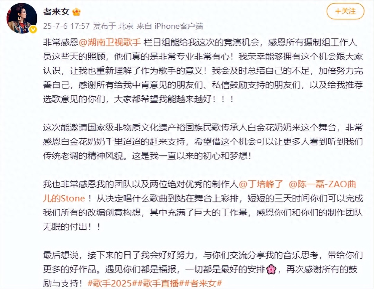 7月6日,音乐人者来女发文告别《歌手2025》: