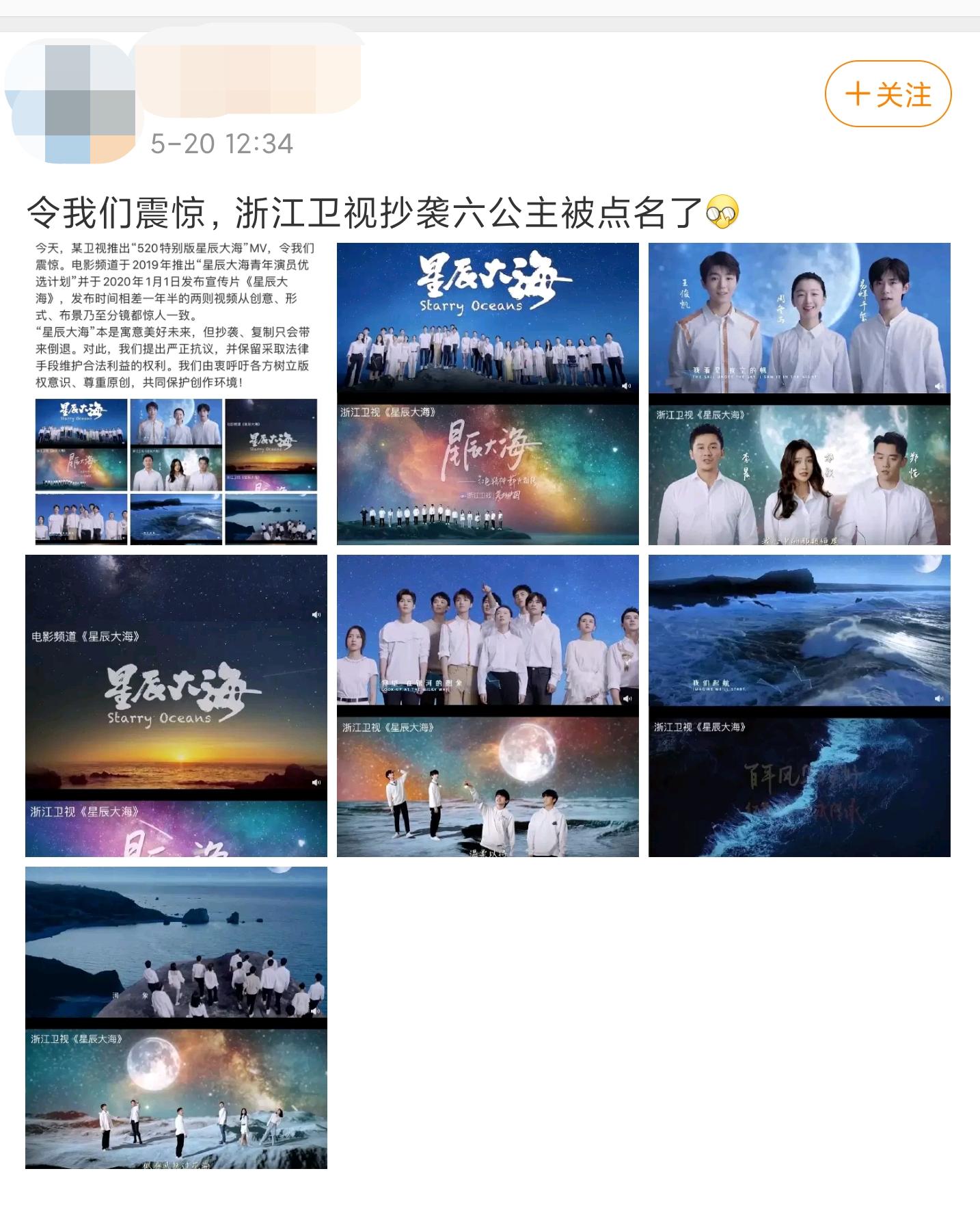 5月20日,有媒体在社交平台上发文称,央视CCTV6电影频道,官方指责浙江卫视抄袭:某卫视推出的“520特别版星辰大海”的MV,抄袭了电影频道于20年1月份发布的宣传片《星辰大海》。