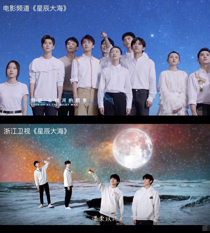 再来看看MV里面人物的站位对比。央视是由王俊凯、周冬雨和易烊千玺,按照男两边女中间的站法进行歌曲的演唱。这不就巧了吗?浙江卫视也是李晨和郑恺两位男士站在两边,而Angelababy则站在中间,就连背景都懒得创新,同款的半透明大月亮挂在星空。