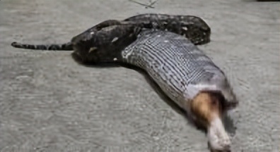 人们来到现场后,蟒蛇慌了,因为刚吃了顿饱饭,肚子还大着没法行动。为了活命,它将刚吞进去的羊整个吐了出来。