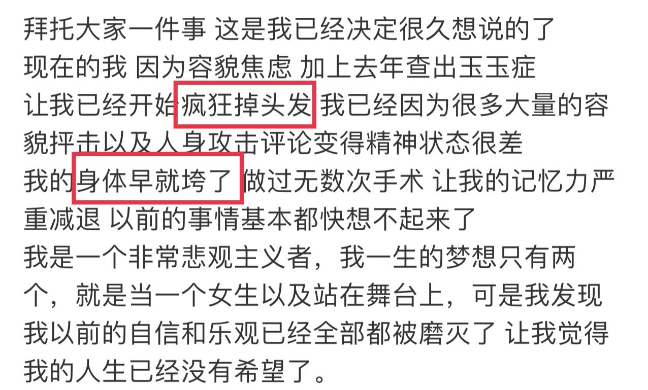 在长文中他先是提出自己因为容貌焦虑和抑郁症疯狂掉发。