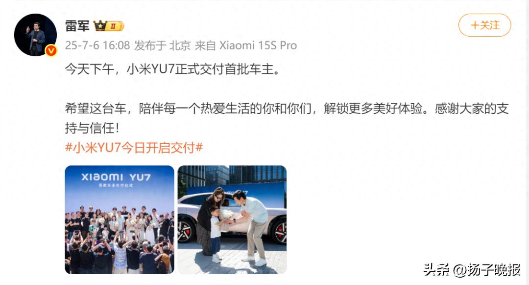7月6日下午,雷军发文:今天下午,小米YU7正式交付首批车主。希望这台车,陪伴每一个热爱生活的你和你们,解锁更多美好体验。感谢大家的支持与信任!