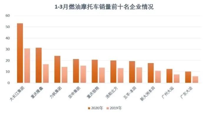 据中国摩托车商会统计,受疫情影响,我国2020年摩托车共产销1702.35万辆和1706.67万辆,基本达到去年水平。但今年第一季度摩托车产销量回归近7年最好水平。1--3月份,燃油摩托车前十名企业共销售230.56万辆。