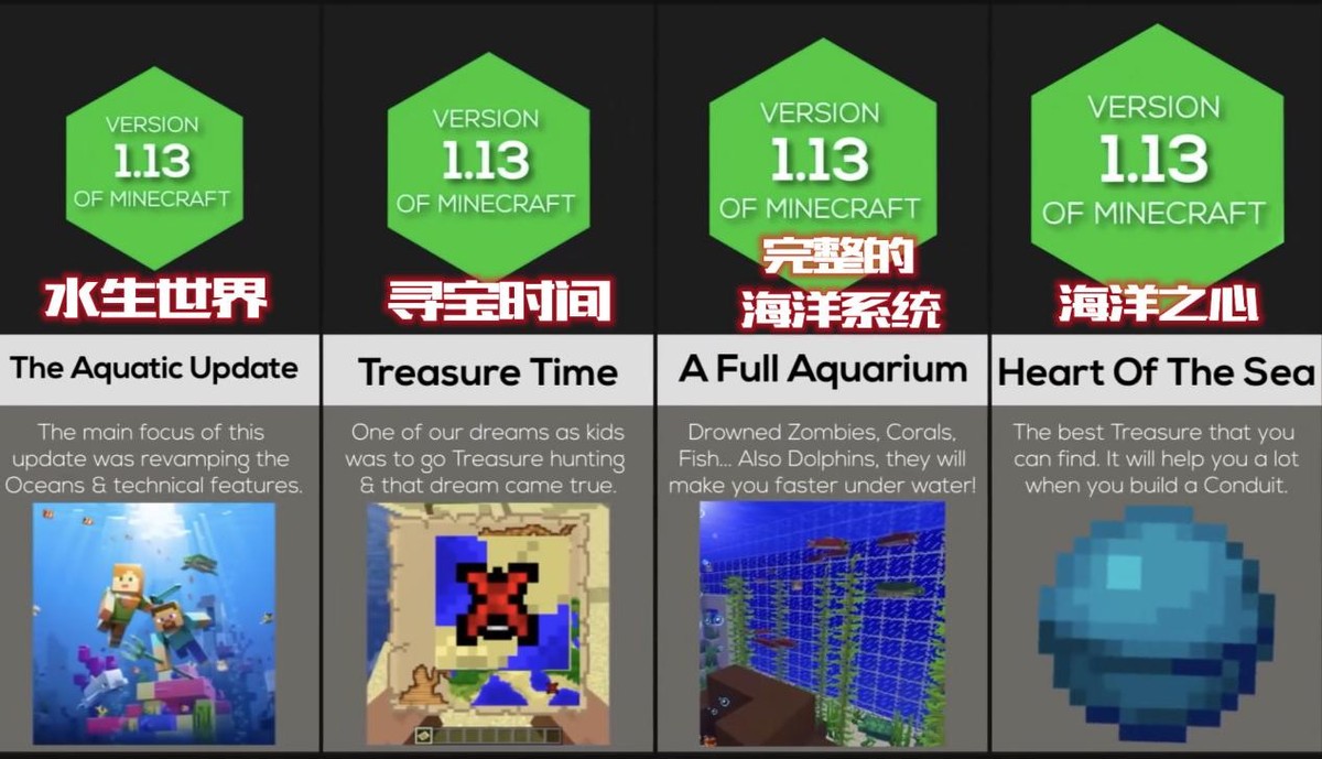 1.13是海洋版本的大更新,宝藏图,海洋之心,水底生态系统,都在这个版本更新啦,大家可以去航海找宝藏啦(好像串戏了~)