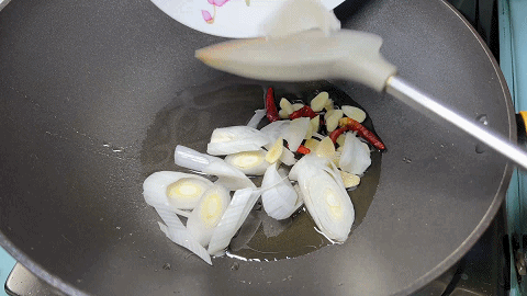 7. 起锅烧油加入葱蒜片和干红辣椒爆香,加入蚝油翻炒