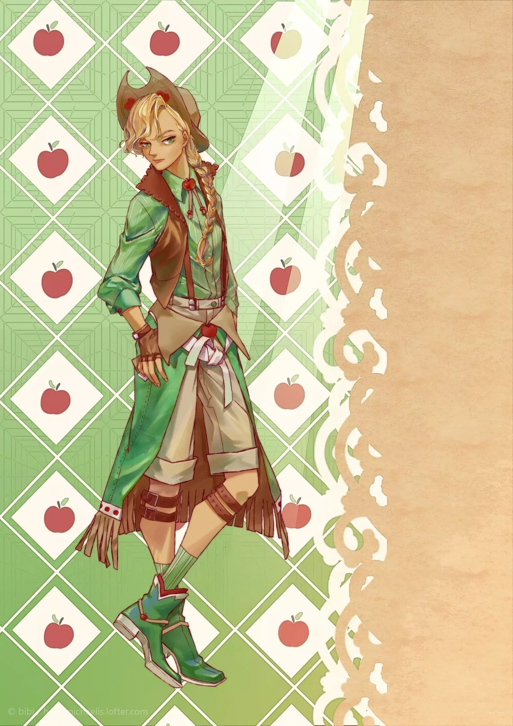 苹果嘉儿和云宝是这部作品两个被设定为“男性化”的小马,如果说云宝是男孩子性格,那么苹果嘉儿就是“彻彻底底”的男孩子外貌和性格。力大无穷的苹果嘉儿被拟人之后,极具西域牛仔风格的衣着打扮,你看她一脸不屑的眼神,这才是苹果嘉儿最酷的样子,即使是女儿身,却比女孩子更加有魅力,比男孩子更精致。