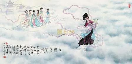 一天,牛郎赶牛走进了一片陌生的树林,这里山青水秀、鸟语花香。牛郎见到九个仙女驾着祥云落在河的草地上,然后脱去五彩霓裳,跳进清澈见底的河水里,牛郎盯着一个最美丽的仙女。看得入了神,这时老牛突然悄怡说话了:“她是天上的织女,你只要拿走五彩霓裳,她就上不了天,她会做你的妻子。”牛郎悄悄地沿着树从,轻轻拿走了织女的五彩霓裳。