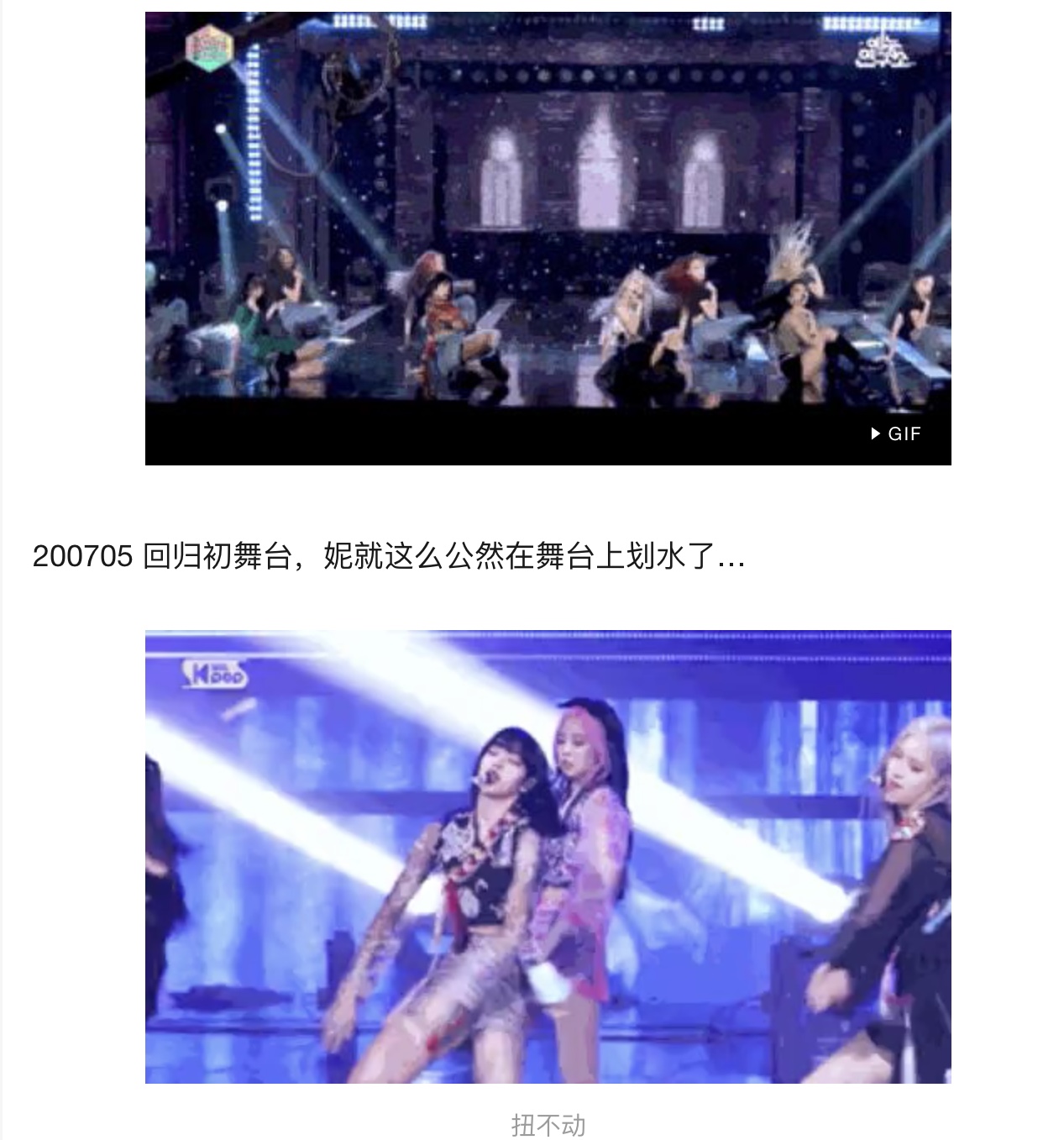 而她舞台上频频划水,似乎也有了理由,时间都拿去和偶像谈恋爱了,怎么挤得出来练习?经常改动作掩饰与队员不协调的事实,回归舞台公然划水,初舞台也时不时露出松懈的真实神情……