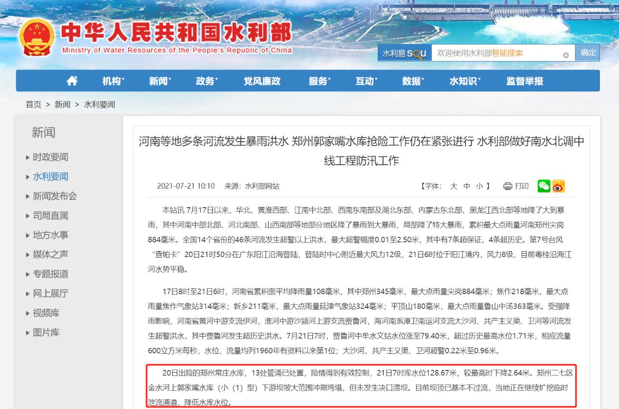 郑州常庄水库和郭家嘴水库一度出现险情。根据水利部网站2021年7月21日10点消息,7月20日,郑州常庄水库出现险情,13处管涌已处置,险情得到有效控制;郭家嘴水库下游坝坡大范围冲刷垮塌,但未发生决口溃坝。