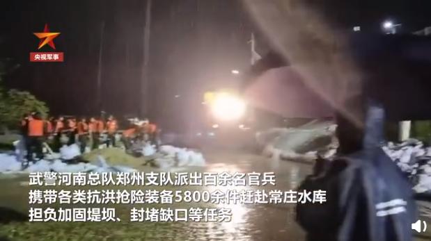 据央视军事新闻,20日晚,武警河南总队郑州支队派出百余名官兵,携带各类抗洪抢险装备5800余件赶赴常庄水库,担负加固堤坝、封堵缺口等任务。