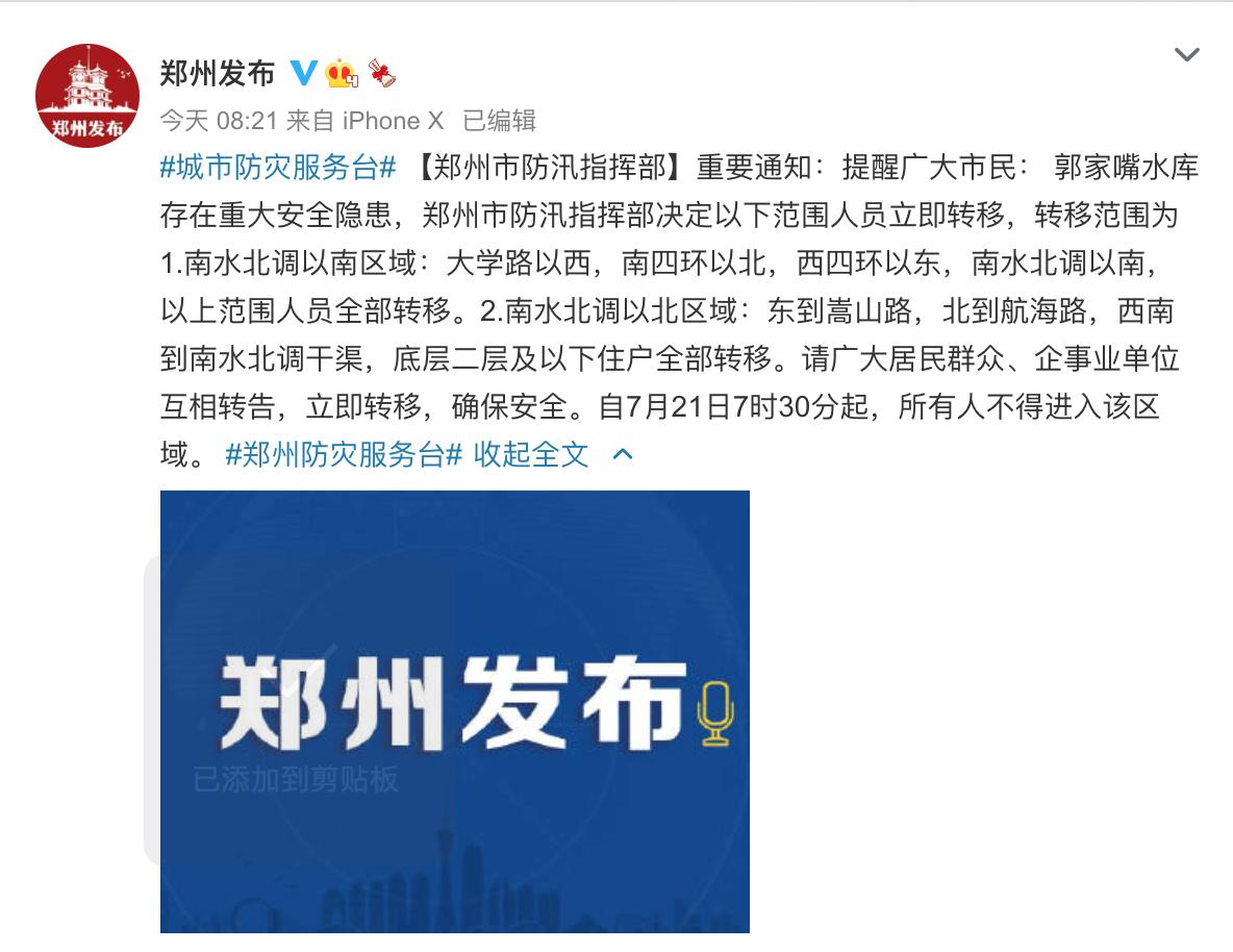 郭家嘴水库下游地区群众紧急疏散。郑州市防汛指挥部21日8时发布通知,郭家嘴水库下游,南水北调以南区域——大学路以西,南四环以北,西四环以东,南水北调以南范围人员全部转移。南水北调以北区域——东到嵩山路,北到航海路,西南到南水北调干渠,底层二层及以下住户全部转移。