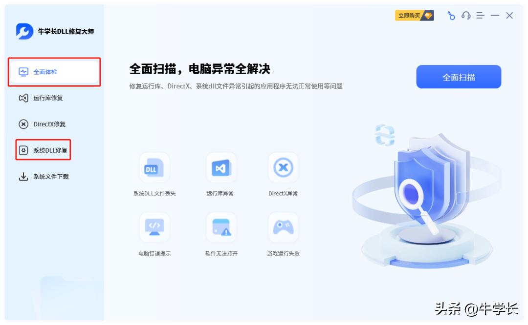 如牛学长新推出的牛学长DLL修复大师,支持修复各类dll文件丢失、异常和错误问题,支持修复运行库和DirectX报错问题,还支持全方位扫描常见软件和游戏报错问题,并一键修复!