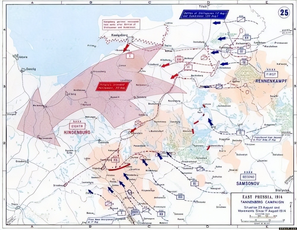 如果再看之前的第一次世界大战,俄罗斯同样是以极为惨重的伤亡参与战争的。1914年8月17日俄德开战第一仗的坦能堡战役(又称“坦嫩贝格战役”)中,由雅科夫·格里戈里耶维奇·日林斯司令基率领的俄罗斯帝国第一集团军,与亚历山大·瓦西里耶维奇·萨姆索洛夫司令率领的第二集团军共计约28万人攻入东普鲁士。保罗·冯·兴登堡、埃里希·冯·鲁登道夫率领德军仅15万人迎战。结果是德军以仅仅2万人的伤亡为代价,几乎全歼俄罗斯两个集团军。德军是先利用俄两个集团军之间有过大的空隙,分割包围了第二集团军并予以全歼,第二集团军司令萨姆索洛夫自杀身亡。后又以胜利之师集结全军围歼俄第一集团军,日林斯司令仅带领少数人逃出,第一集团军绝大多数被歼灭和俘虏。