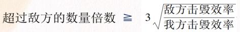 以上数学公式以及基于这个公式的推导,一般读者可能读起来很费劲,可参见我写的《超越战争论》。此处我们就完全省略了,只给出由它推导出的一个重要的结论。就是进行一场战役时,在特定的战争维里必须集中的数量优势精确计算公式为: