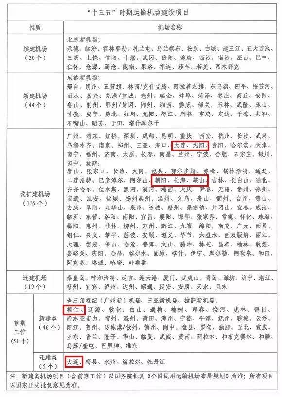《规划》显示,桓仁将新建机场,大连、沈阳、朝阳、长海、鞍山将改扩建机场,大连将迁建机场。