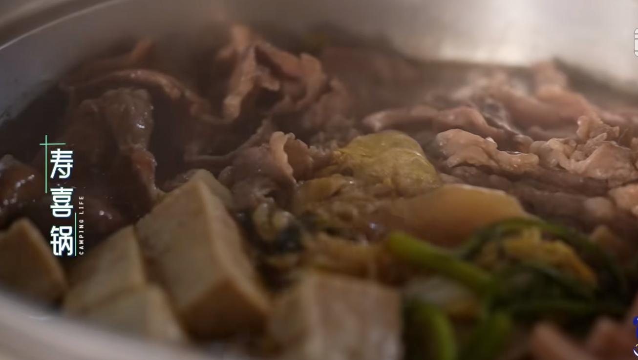 黄雅莉的寿喜锅里有牛肉卷、豆腐、青菜,看起来特别的美味。