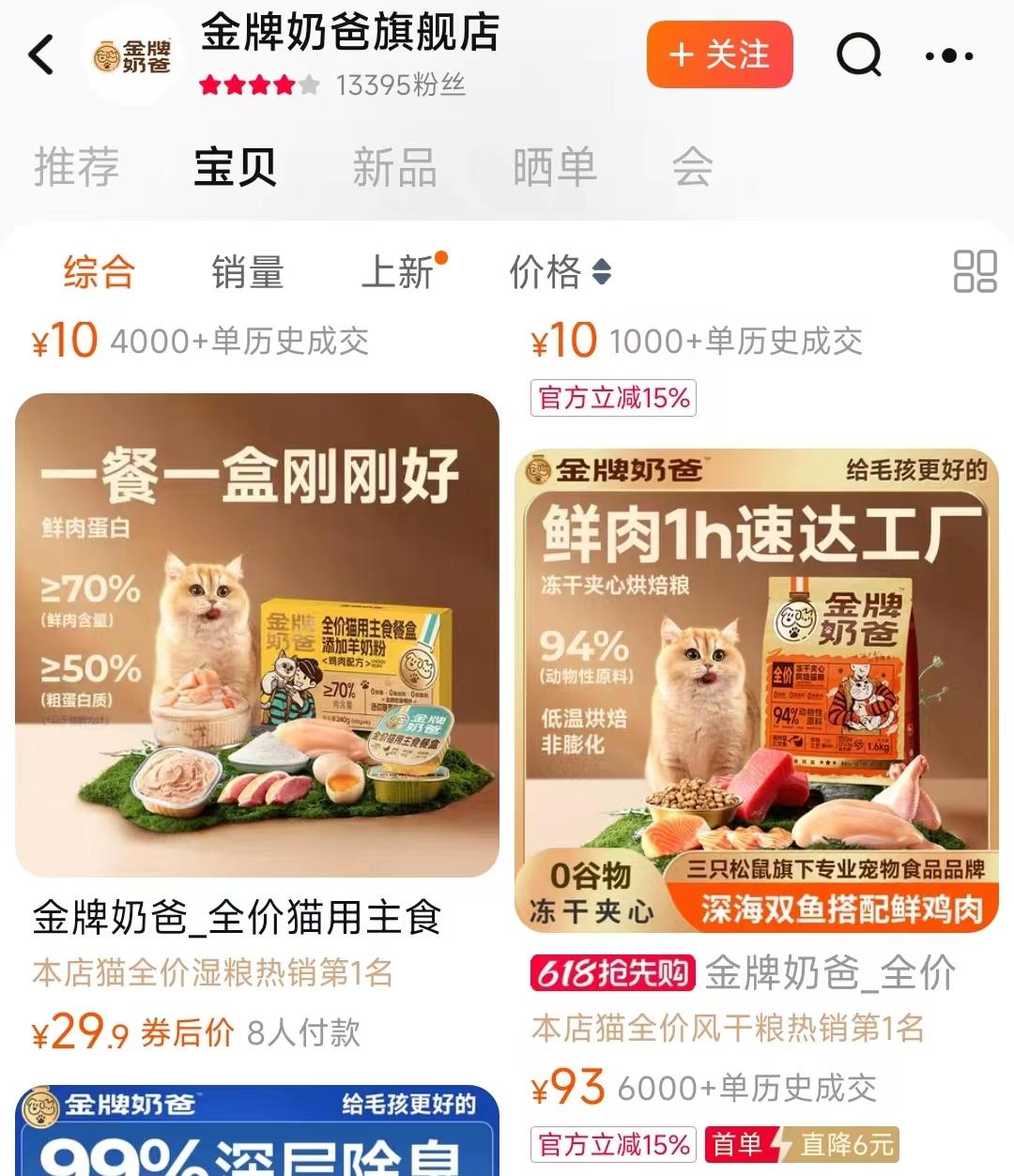从“金牌奶爸”的天猫旗舰店来看,目前粉丝数量近14000人,产品已推出包括全价冻干夹心烘焙粮、冻干生骨肉犬粮、全价猫用主食餐盒、宠物零食冻干、湿粮猫罐头以及猫砂等,涵盖了猫狗主粮、零食和基础用品等细分领域。其主打烘焙猫粮价格为58.125元/kg,并取得了超过6000份的成绩。