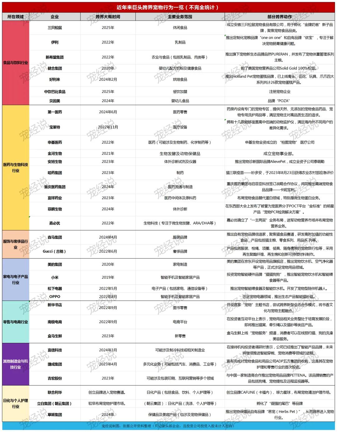 在此背景下,除了三只松鼠以外,还有30余家头部企业入局了宠物领域,且涵盖食品饮料、医药健康、零售电商、服装时尚、科技家电等诸多行业。涉及伊利、蒙牛、第一医药、盒马、森马集团、新华书店等多家各领域龙头企业。其中,食品饮料和医药健康领域的跨界企业最多。