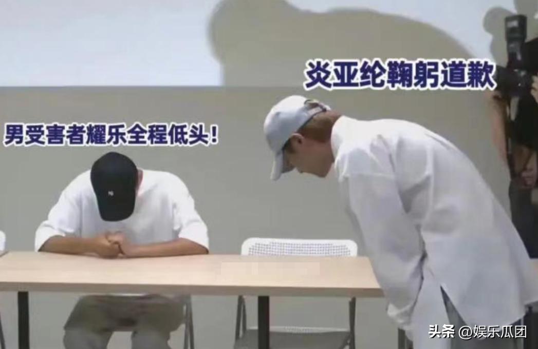 而化妆精致妆容的炎亚纶就这样闯了进来,面对媒体进行了道歉,并且向耀乐鞠躬道歉,“要郑重地跟你说对不起,抱歉。”