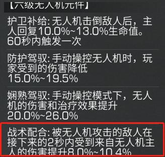 在为主、副武器进阶时可以选择进阶无人机元件中的战术配合属性,当无人机与主人攻击相同敌人时在接下来的2s内,主人对敌人的伤害将提升一定比例。Tips:从无人机开始攻击敌人直至无人机停止攻击,伤害提升的2s无冷却时间。