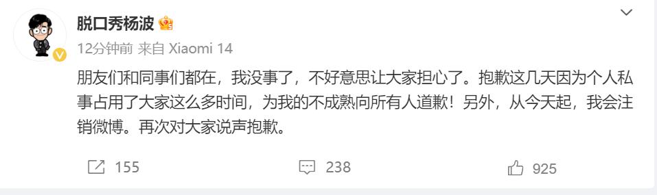2月4日,@脱口秀杨波 发文道歉:朋友们和同事们都在,我没事了,不好意思让大家担心了。抱歉这几天因为个人私事占用了大家这么多时间,为我的不成熟向所有人道歉!另外,从今天起,我会注销微博。再次对大家说声抱歉。