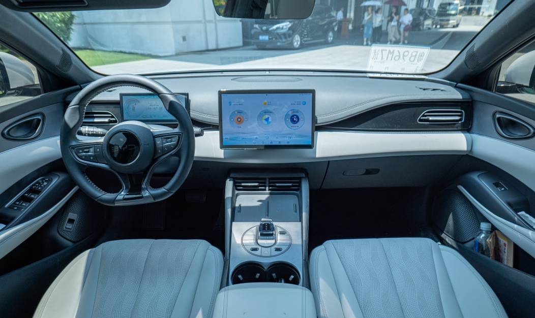 接着聊聊它的驾驶感受和油耗水平,这两点都给我很大的惊喜。它的长度为4830mm,但开起来的感觉整体不像中型车,跟开紧凑型车一样轻松惬意。而宝马3系长度为4838mm,跟海豹06 DM-i几乎一样长,它的操控也非常优秀,但你开起来还是能明显感觉出来是一辆“大车”。这个除了跟底盘悬架和调校有关系之外,视觉上的影响也很重要,比如驾驶员的前方没有什么明显遮挡。主驾仪表和中控屏没有凸出中控台太多,视野越干净,你的相对感应速度会更直接。其次就是方向盘尺寸很小,转向手感也轻盈,视觉和触觉上的双重清爽。