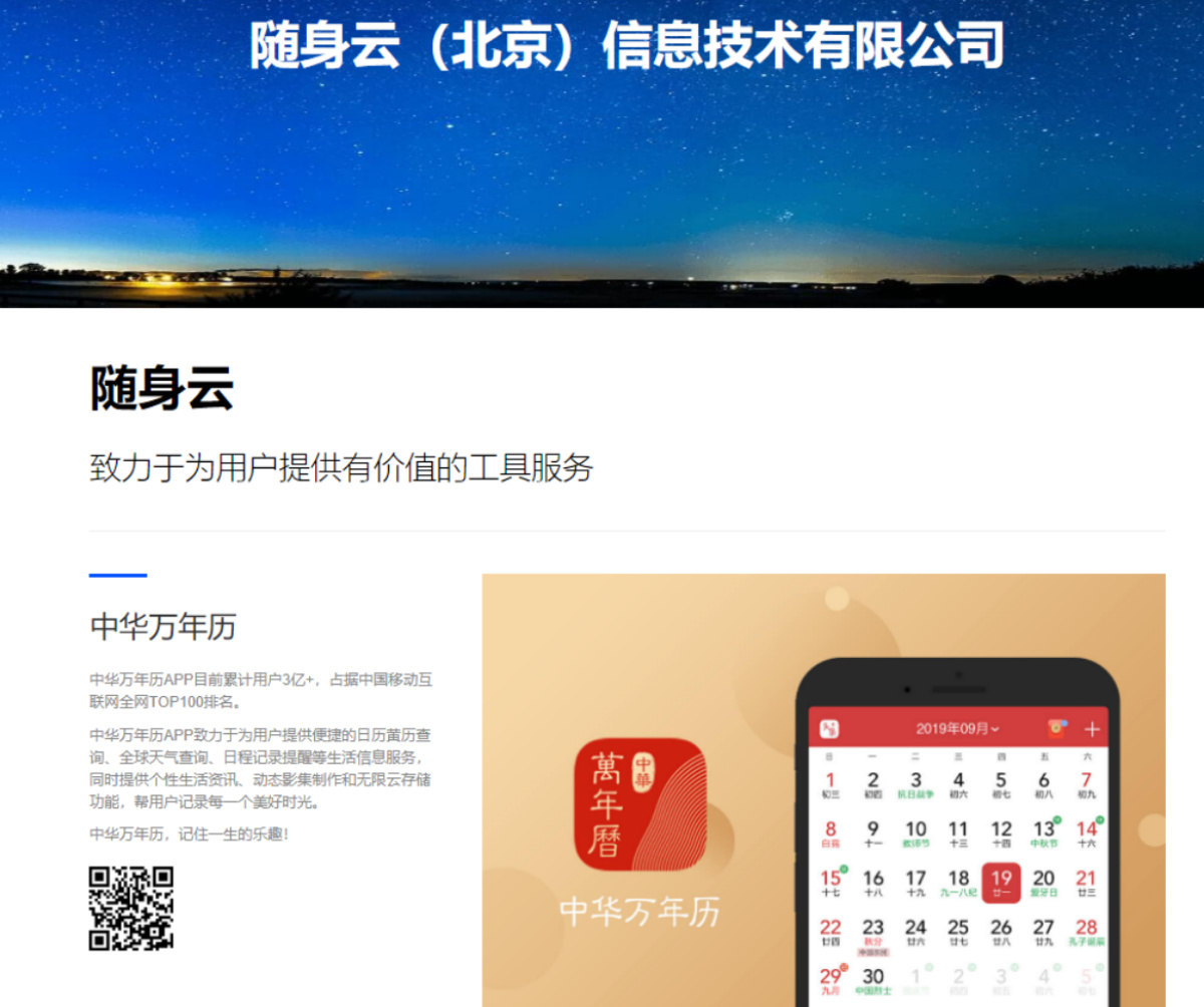 资料显示,中华万年历是随身云(北京)信息技术有限公司推出的国内最大的多平台云日历应用,目前累计用户3亿+,占据中国移动互联网全网TOP100排名,致力于为用户提供便捷的日历黄历查询、全球天气查询、日程记录提醒等生活信息服务,同时提供个性生活资讯、动态影集制作和无限云存储功能等。
