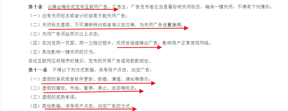国家市场监督管理总局发布的《互联网广告管理办法》中进一步明确,其中第十条规定,以弹出等形式发布互联网广告,广告主、广告发布者不得有下列情形,包括没有关闭标志或者计时结束才能关闭广告;关闭标志虚假、不可清晰辨识或者难以定位等,为关闭广告设置障碍;关闭广告须经两次以上点击;在浏览同一页面、同一文档过程中,关闭后继续弹出广告,影响用户正常使用网络。