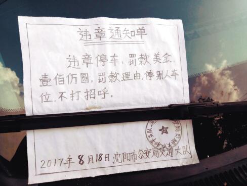 沈阳街边现手绘罚单罚百万美金 因停他人车位不打招呼