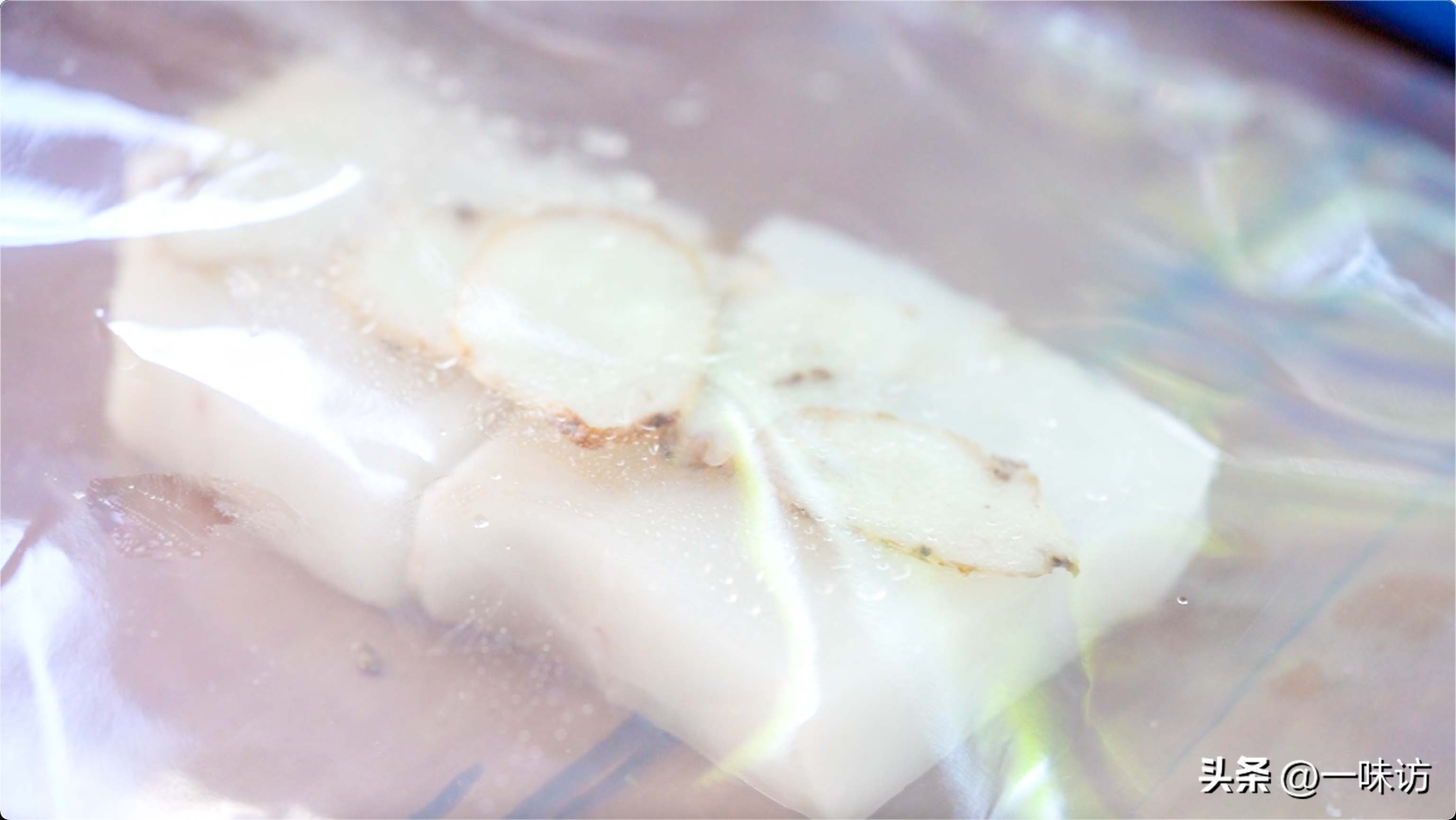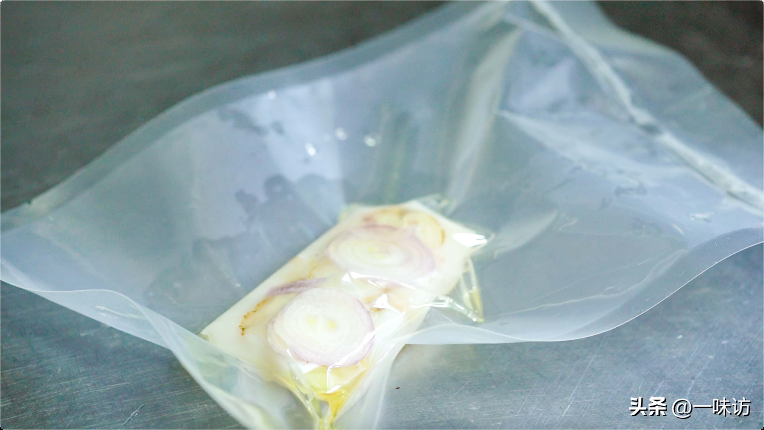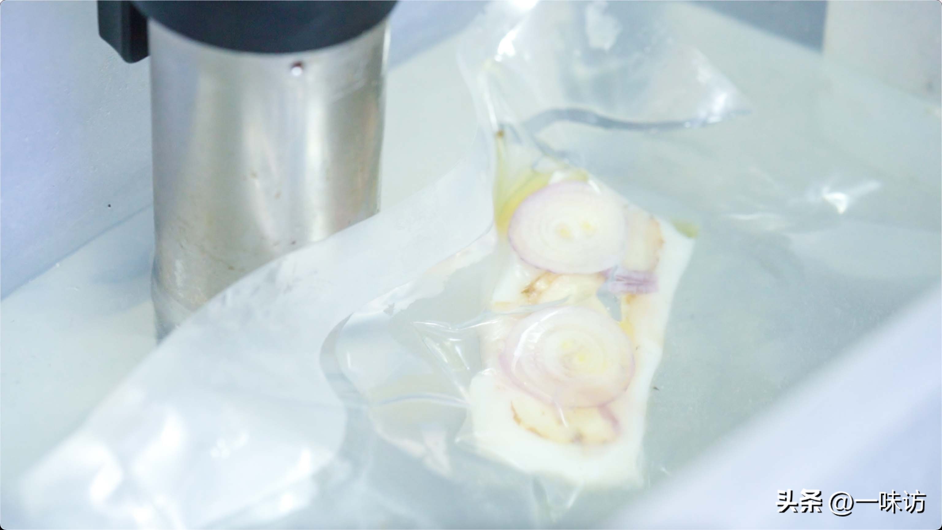 找一个干净的真空包装袋,打开带子把切好的鳕鱼块放入然后放上刚才备好的姜片、葱头片,用真空泵抽干里面的空气放在一旁。大厨说最好用62度的温水来烹饪,家里面不好掌握的话可以用电饭锅来烹饪。