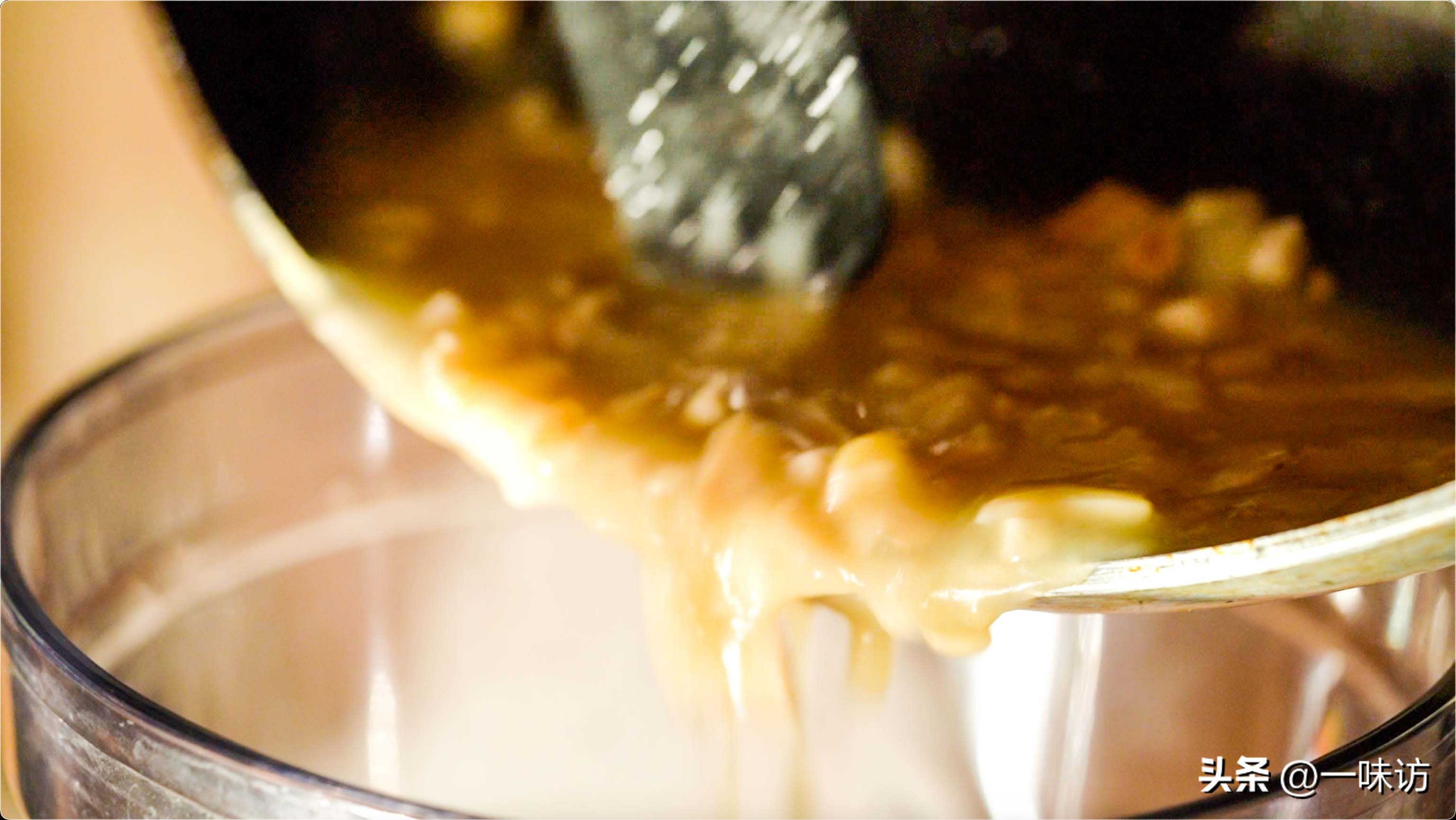 等上几分钟汤汁变得粘稠就能关火了。凉一会把汤汁倒入料理机里粉碎成酱,然后用滤网过滤一下,这香气扑鼻的松茸酱就做好了。