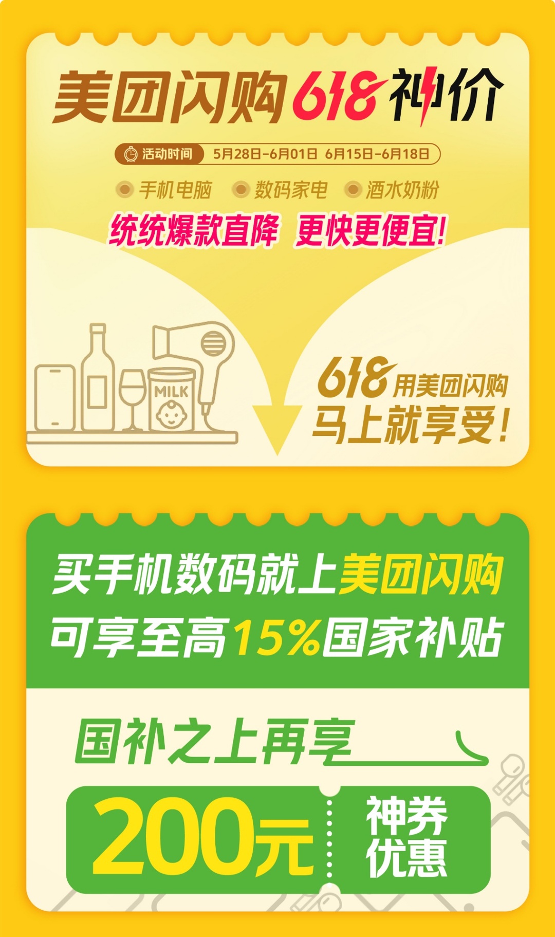 这是618大促首次覆盖“餐饮外卖+购物”的生活消费全品类,美团将携外卖、闪购两个业务重点参与,联动知名餐饮、零售品牌旗下的百万家线下门店,为用户打造吃喝购物都低价的消费体验。在618元大额优惠权益的基础上,美团外卖将发放“天天必膨,满18减18”的618外卖神券,帮助消费者吃喝省钱;美团闪购将上线618神价,打造手机电脑、数码家电、酒水奶粉等品类的大牌商品低价,品牌门店直发,30分钟送达。