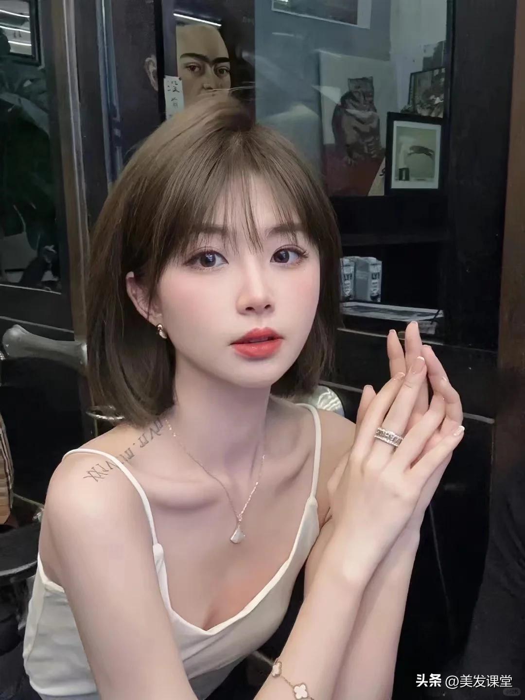 如果圆脸和颧骨高,脸方的小姐姐希望通过发型修饰脸型的姐妹们,不要错过这一款发型,这种发型不仅适合各种场合,而且很好搭配很多衣服 ⭕️专业建议:两侧根据发量和脸型一定要剪刘海,可以适当放长一点,前面的刘海到眼睛和眉毛中间略微有点遮眼的感觉,不建议剪得太厚重,两侧八字刘海前短后长,鬓角可以掖到耳后,搭配后脑勺修剪的层次显得十分饱满有型「初恋妹妹头」减龄魔法全解析|一秒重返18岁的秘密武器 ✨