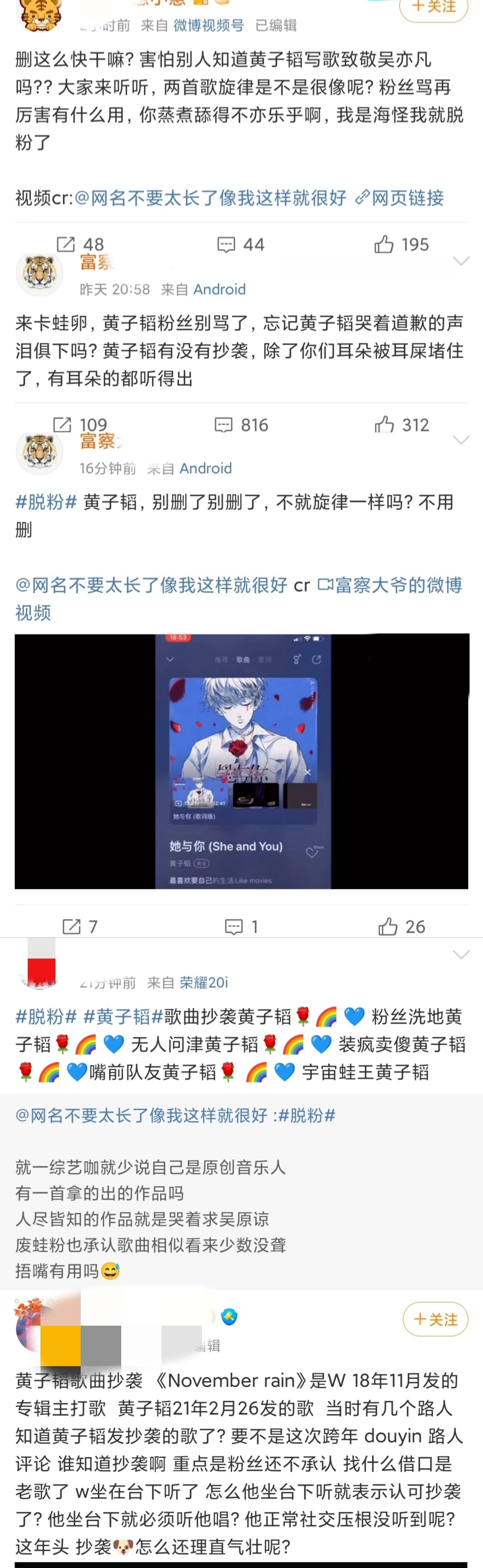 还有黄子韬粉丝指出吴某凡粉丝空口鉴抄袭,过于滑稽和搞笑了。在当年微博之夜黄子韬首次唱《她与你》时,吴亦凡和其粉丝并无任何反应,一年后才开始破防,过于奇怪了