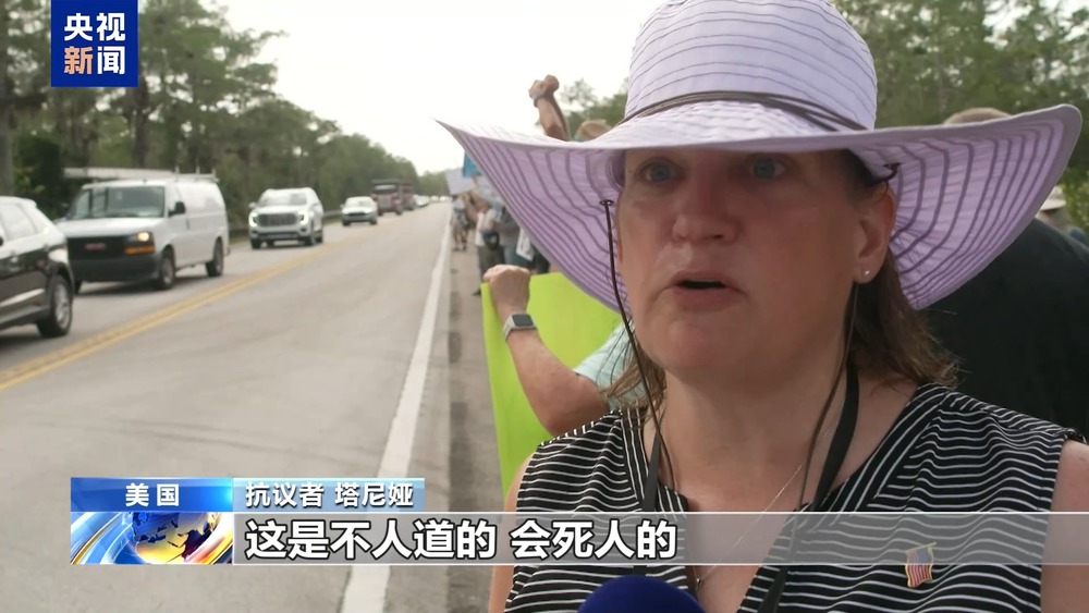 抗议者 塔尼娅:第一,他们怎么能在飓风季把5000人关在佛罗里达州的沼泽里?这是不人道的,会死人的。第二,从财政上来讲太不负责任了。政府效率部赶紧来查一查,每年花4.5亿美元为了什么?这根本毫无意义,太令人生气了。