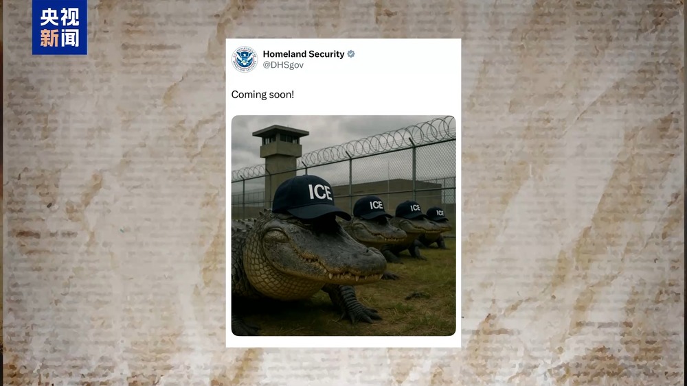 美国国土安全部的官方社交账号甚至发了一张图片,一群鳄鱼头戴着“移民与海关执法局”棒球帽,在高墙电网外面虎视眈眈。下面有网友留言说: