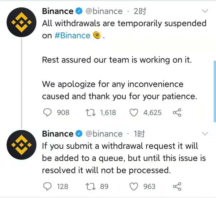 5月10日晚,加密货币交易平台币安在其官方推特上发文表示,所有提款都将暂时停止。