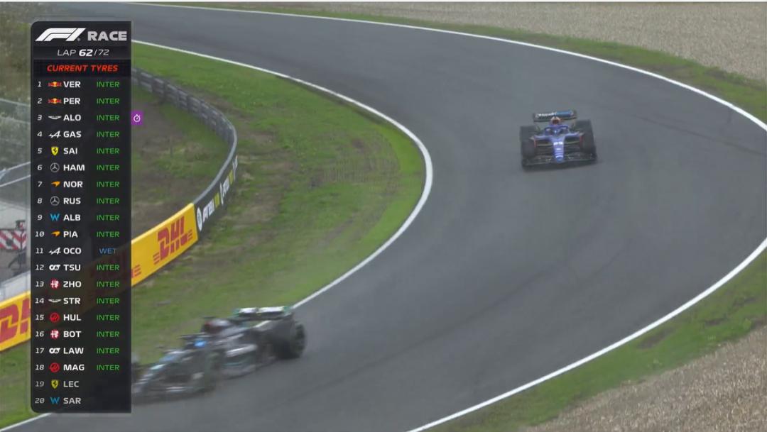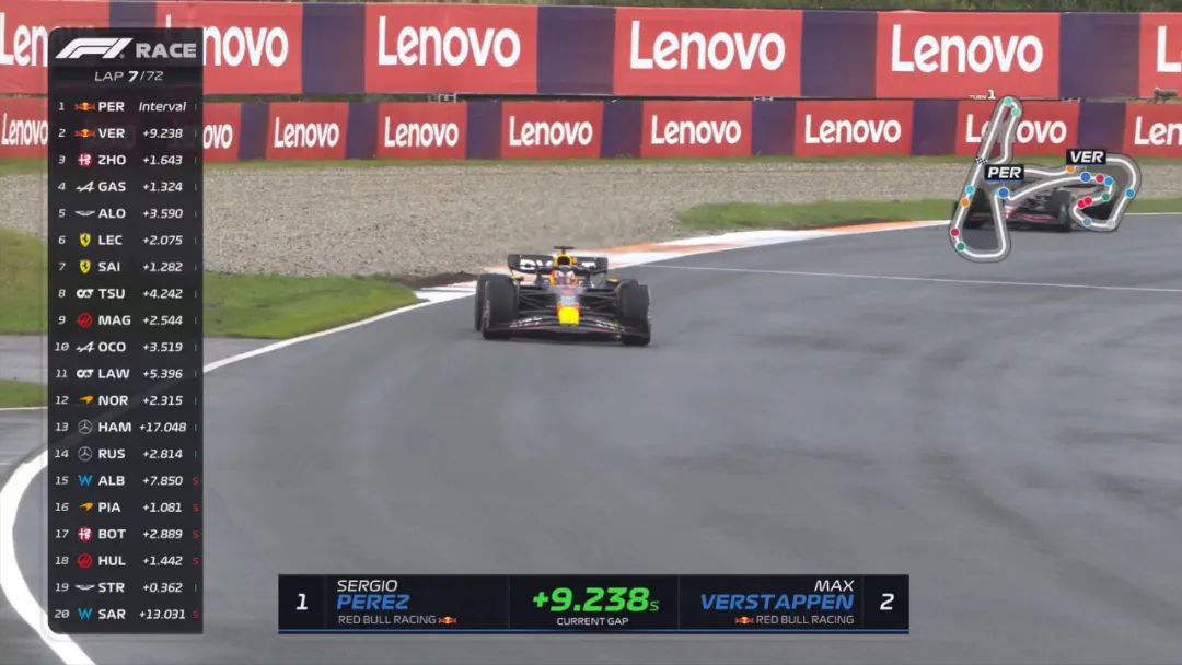 之后陆续有车手进站,但也有车手依旧坚持使用干地胎。第7圈,维斯塔潘超越周冠宇,来到第二。