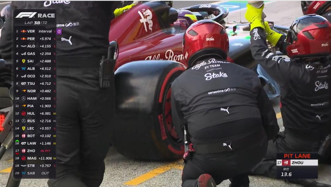 第38圈,周冠宇进站更换软胎,出站后排在第17。