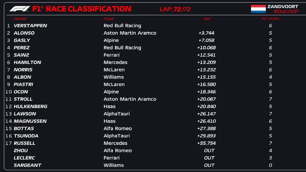 最终,维斯塔潘夺冠,阿隆索带回亚军,佩雷兹被罚时后掉至第四。加斯利递补获得季军。