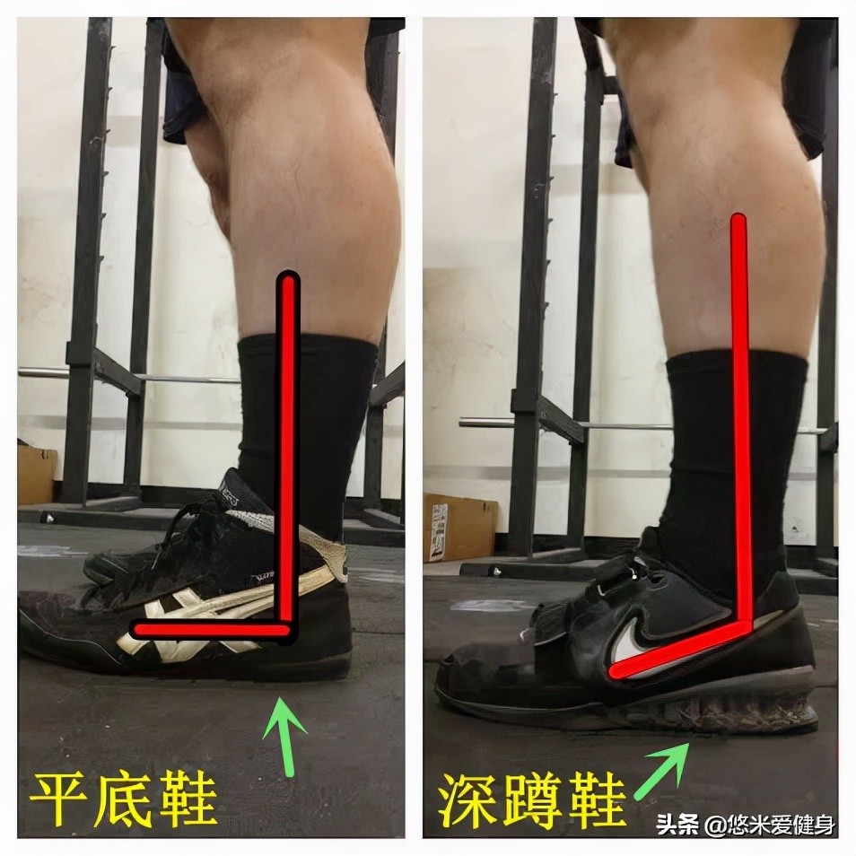 此时需要穿着特制深蹲鞋,相当于垫高了脚后跟,增加了脚踝活动度,这样身体重心始终维持在足中心位置,避免了身体过度前倾的问题,还能让下蹲幅度更低。
