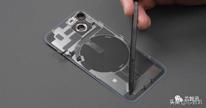 卸下固定无线充电排线的螺丝和盖板即可分离后盖。后盖后盖内侧有无线充电模块,上方覆盖有散热膜,后盖上还集成了闪光灯和后置麦克风。