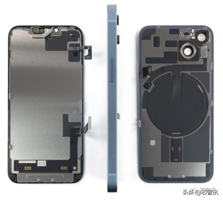 这里需要指出的是,全新的iPhone 14和iPhone 14 Plus(Pro系列则不是)均采用了不同以往的“三明治”式的内部结构设计,屏幕和背壳都是可以轻松单独拆卸下来的,这样非常便于屏幕和后盖的维修或更换。