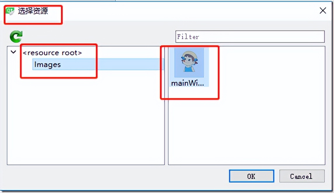 再点击“选择资源”或者“选择文件”,点击“Images”,再选中资源文件“mainWindow.jpg”,最后点击“OK”。