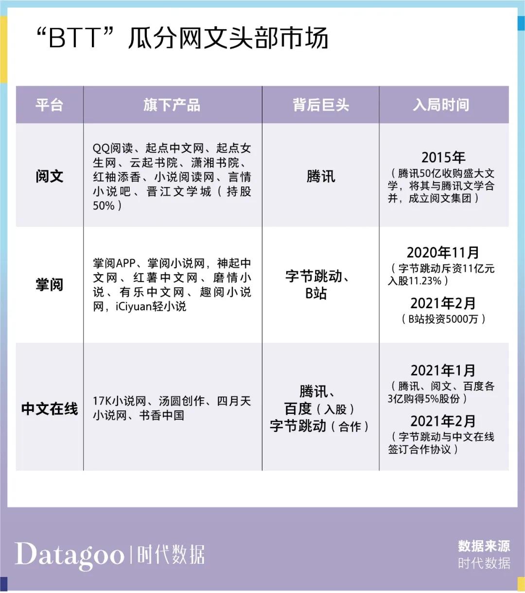 阅文集团、掌阅科技等巨头相继上市。此后,伴随着阿里、百度、头条等巨头争相入局,网文市场三分天下。