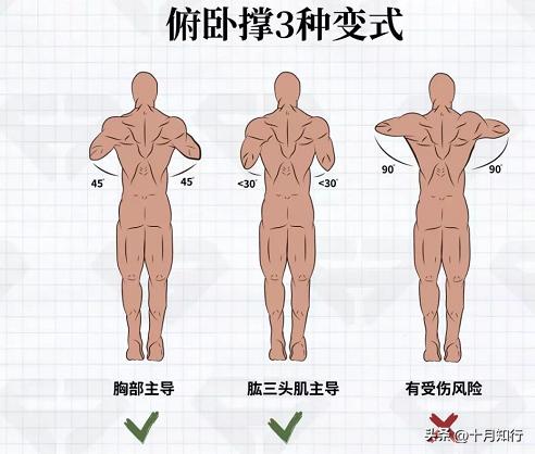 大臂与躯干间夹角不同会使得主要刺激目标不同,比如当大臂贴近身体时会主要锻炼肱三头肌;当大臂与躯干间夹角略小于45度时则主要锻炼胸肌,当大臂与躯干间的夹角接近90度时则主要锻炼三角肌,不过,当大臂与躯干间夹角接近90度时,肩关节就会承受更多的压力,从而增加受伤的风险,所以一般情况下并不建议这么做,除非能力很强大。