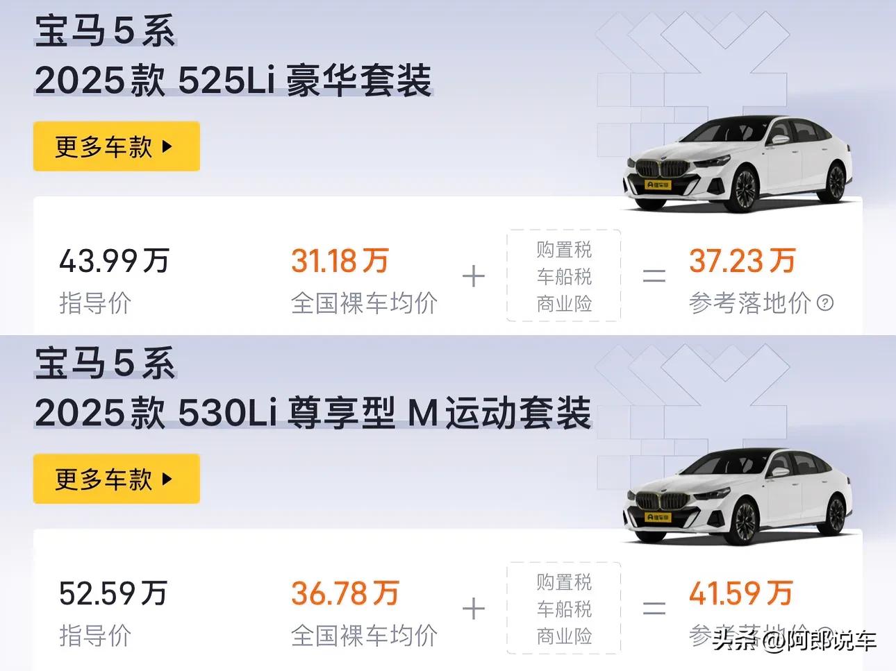 宝马5系525Li入门豪华版:官方指导价43.99万,综合优惠后落地大概35万左右。
