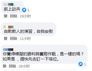 然而就媒体披露的台军在这场推演中靠“奇袭”取胜的说法,社交媒体脸书上有岛内网友留言酸讽:“纸上谈兵”、“自欺欺人的演习”、“你觉得模拟的胜利与实际作战,是一样的吗?”