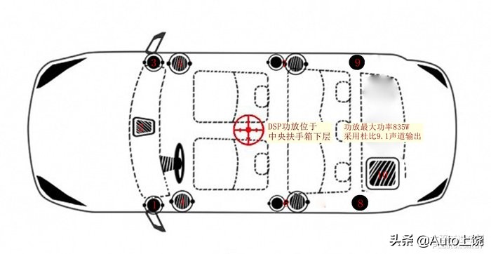车辆配有DSP功放,峰值功率835W,用来驱动15只扬声器,看着音响的数据还是可以的